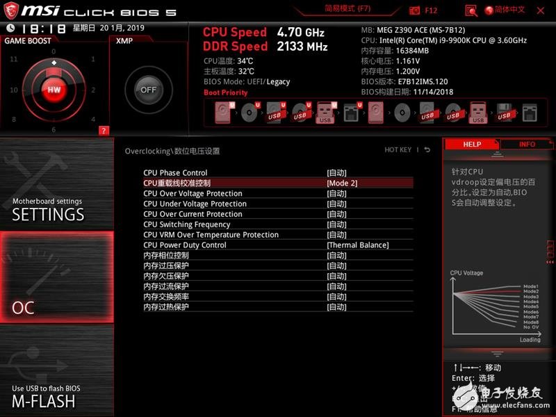 “CPU重载线校准控制”用来设置防掉压。右边的坐标图可以显示每一级别选项的掉压情况,“Mode 2”能够在高负载下保持电压稳定,因此我们也选择了“Mode 2”。