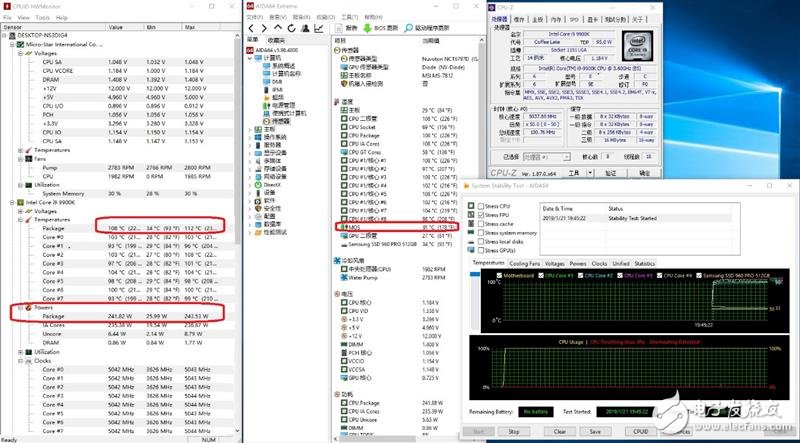 超频到5GHz的i9-9900K不论功耗还是温度都是惊人的!我们使用的水冷散热器并不是太强力,烤机时最大温度达到了112度,而处理器功耗则一直在240W以上。鉴于处理器的温度以及功耗的实际表现,除非更换更加强力的散热器,否则9900K超频到5GHz基本上就到头了。