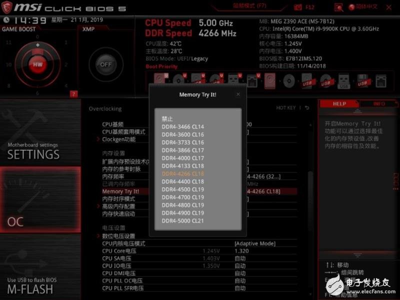 微星主板BIOS的内存超频功能对新手非常友好,“Memory Try It !”里面很贴心的预存了各种频率以及对应的时序,可以自行根据内存的体质选择合适的参数。在这个选项卡中,最高可以设置5000MHz频率以及对应的参数。