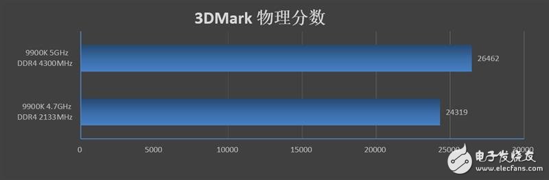 在3DMark测试中,超频到5GHz之后,物理分数提高了2143分,提升幅度接近9%。