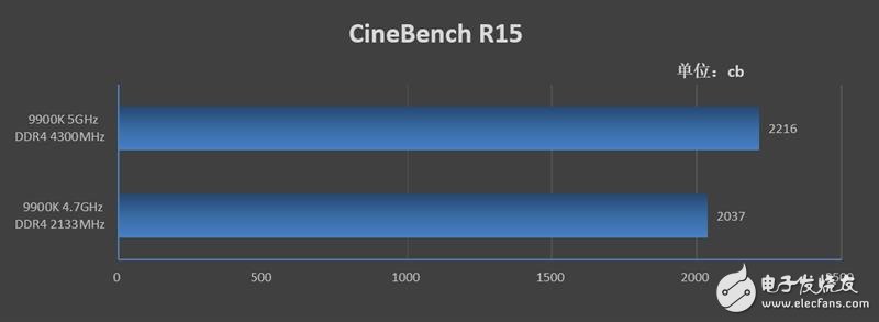 在CineBench R15测试中,5GHz+4300MHz的超频平台相比默频提升了189分,提升幅度达到了9%。