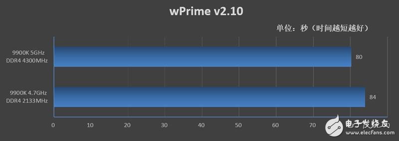 在wPrime v2.1 1024M测试中,5GHz+4300MHz的超频平台用时默频比默频少了接近4秒,提升幅度达到了5%。