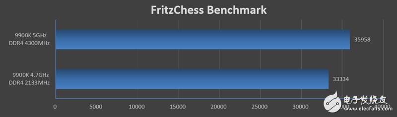 在国际象棋测试中,5GHz+4300MHz的超频平台相比默频提升了2624分,提升幅度接近8%。