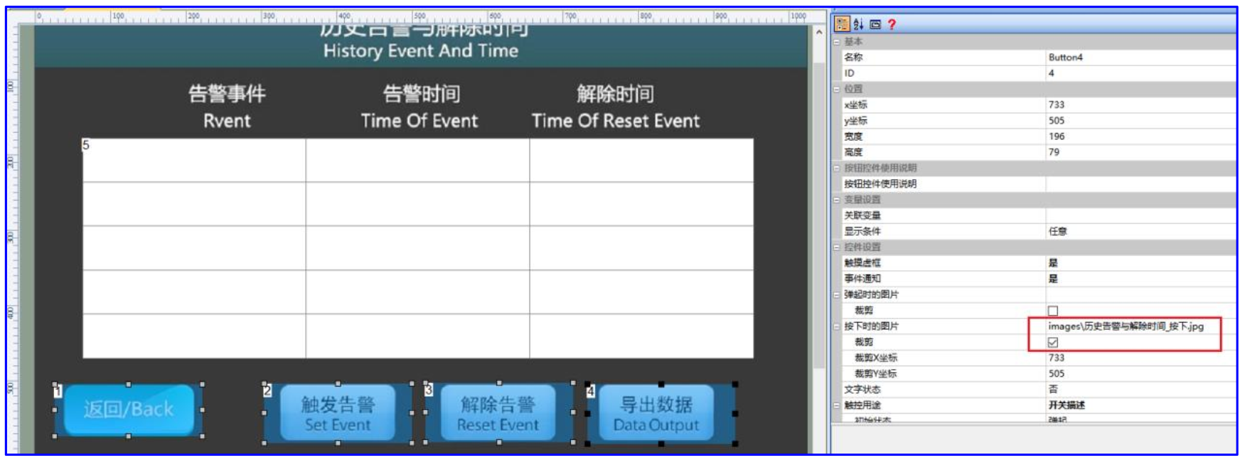 (3) 配置好的按钮控件属性窗口如图3-7所示。选中四个按钮控件,在属性窗口为按钮添加按下时的图片,并勾选裁剪。