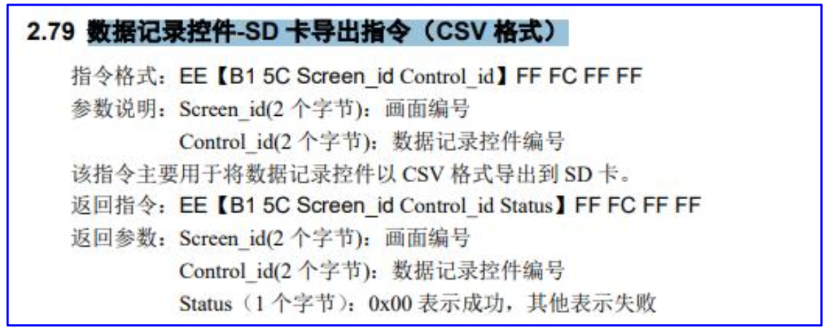 (4) 对导出数据按钮添加一条数据记录控件-SD卡导出指令(CSV格式),指令查询可以查询《大彩串口屏指令集 V5.1 .pdf》,找到SD卡导出指令,如下图 3-8所示: