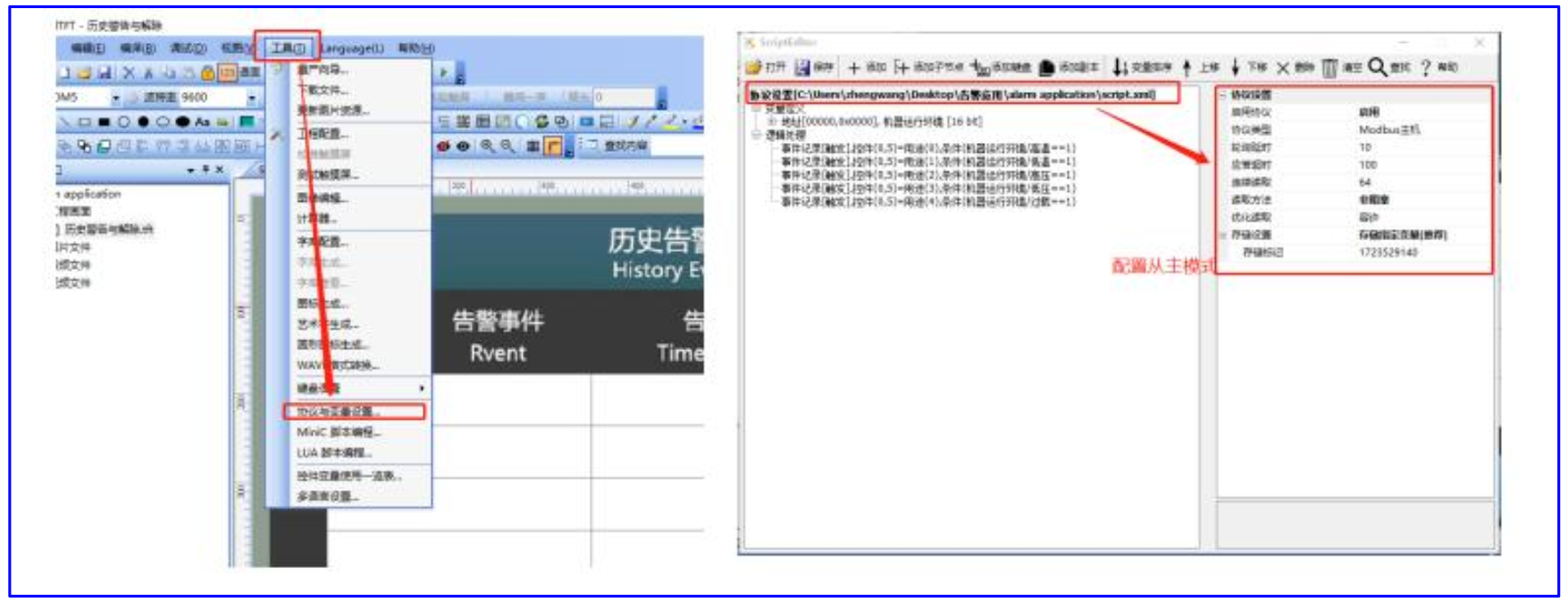 如图3-12所示,打开VisualTFT菜单栏中的【工具】→【协议与变量设置】,点击左侧文件路径,在右侧的协议设置栏,设置协议类型,本例程设置 MODBUS主机模式。详细设置说明参考4.3章节。