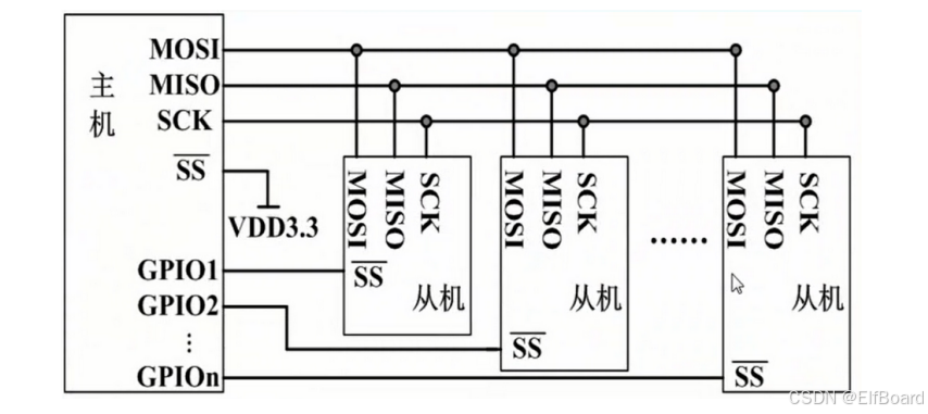 SPI采用主从模式,通常由一个主设备(Microcontroller等控制器)和一个或多个从设备组成。