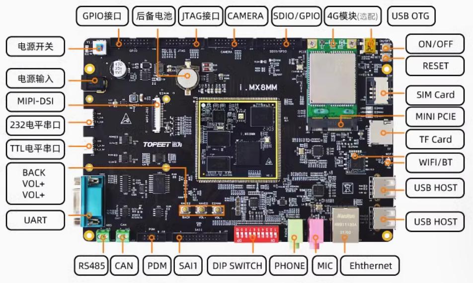 接口丰富:千兆工业级以太网、MIPI-DSI、USB HOST、WIFI/BT、4G模块、CAN、RS485等接口一应俱全。
