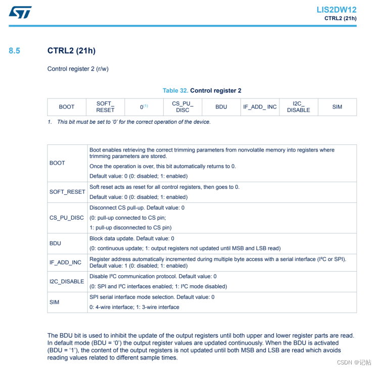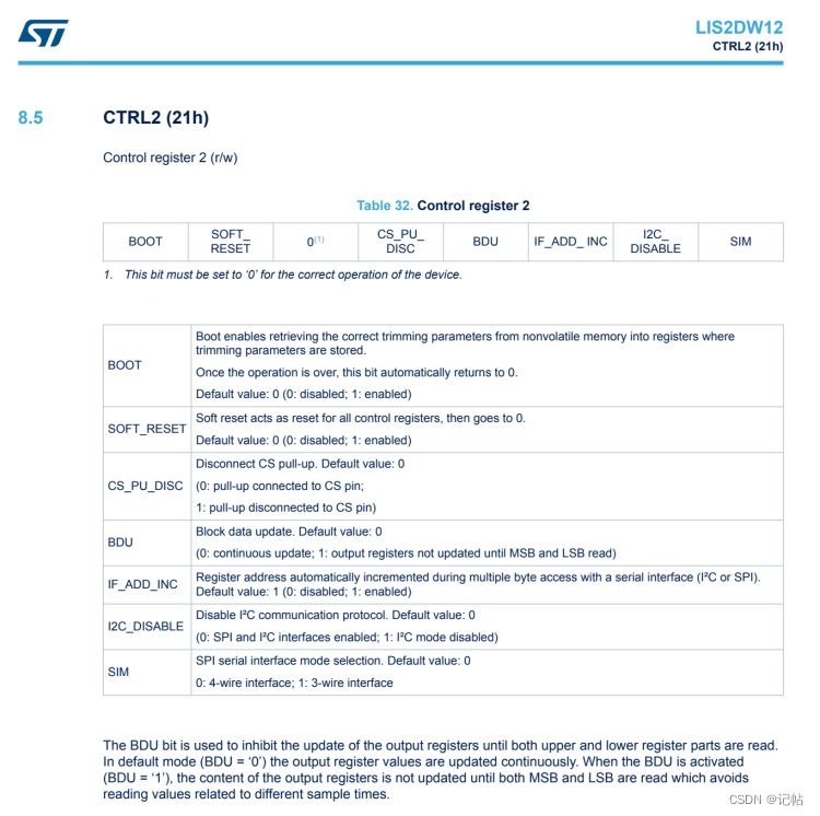块数据更新(BDU)模式(BDU = ‘1’):当激活BDU功能时,输出寄存器中的内容不会在读取MSB和LSB之间更新。这就意味着一旦开始读取数据(无论是先读MSB还是LSB),寄存器中的那一组数据就被“锁定”,直到两部分都被读取完毕。这样可以确保你读取的MSB和LSB是同一测量时刻的数据,避免了读取到代表不同采样时刻的数据。
