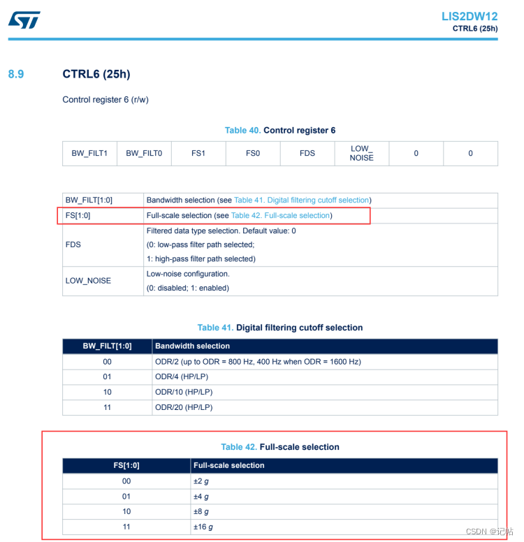 FS[1:0] - 全量程选择:这两个位用于设置传感器的量程。量程决定了传感器可以测量的最大加速度值。例如,量程可以设置为±2g、±4g、±8g或±16g。这允许用户根据应用的特定需求调整传感器的灵敏度。