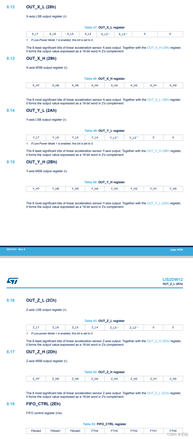 如果 reg 是非零的,说明有新的加速度数据可读。 lis2dw12_acceleration_raw_get(&dev_ctx, data_raw_acceleration);:这个函数调用实际读取加速度计的原始数据,并存储在 data_raw_acceleration 数组中。 数据在28h-2Dh中。