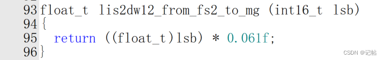 所以,函数中的乘法 ((float_t)lsb) * 0.061f 是将原始的整数值转换为以毫重力(mg)为单位的加速度值。这个转换对于将加速度计的原始读数转换为实际的物理测量值是必需的。