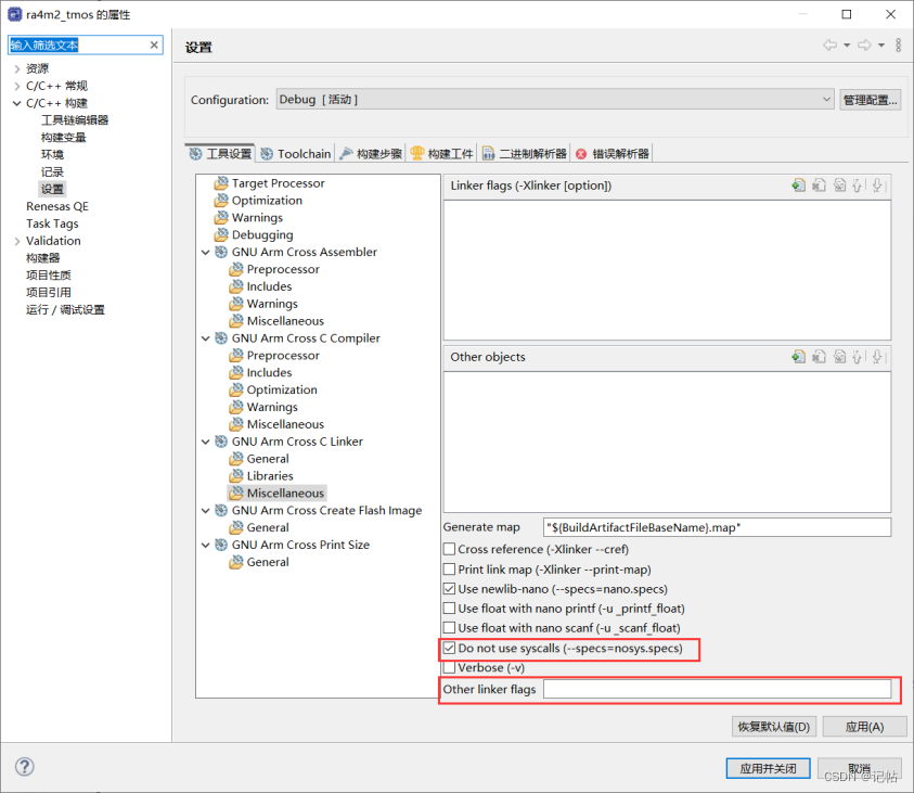 用途: 这个选项用于链接“Redlib”库,这是为裸机(bare-metal)和半主机(semihosting)环境设计的C库的一个变体。半主机环境是一种特殊的运行模式,允许嵌入式程序通过宿主机(如开发PC)的调试器进行输入输出操作。