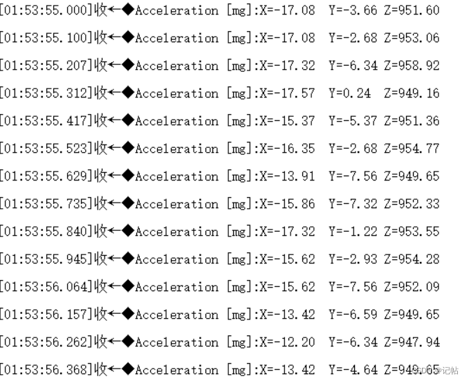 加速度数据首先以原始格式(通常是整数)读取,然后需要转换为更有意义的单位,如毫重力(mg)。这里的转换函数 lis2dw12_from_fs2_to_mg() 根据加速度计的量程(这里假设为±2g)将原始数据转换为毫重力单位。 acceleration_mg[0] = lis2dw12_from_fs2_to_mg(data_raw_acceleration[0]); 等三行代码分别转换 X、Y、Z 轴的加速度数据。