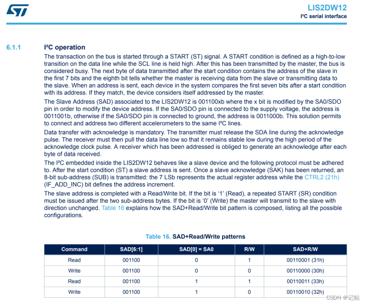 查看手册,可以得知LIS2DW12的IIC地址为“0011000” 或者 “0011001”,即0x18或0x19。