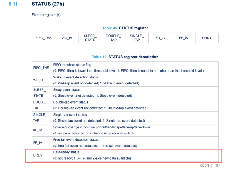 检查新数据是否可用: lis2dw12_flag_data_ready_get(&dev_ctx, ®);:这个函数调用检查加速度计是否有新的数据可读。如果有新数据,reg 变量将被设置为非零值。 主要为读取STATUS (27h)的DRDY位。