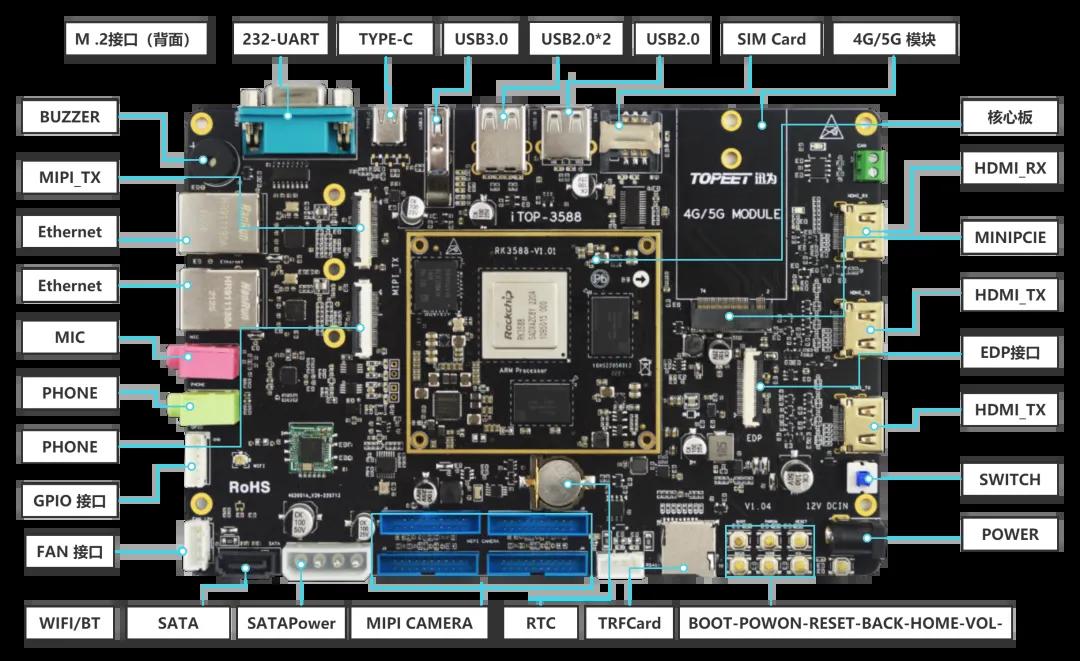 iTOP-RK3588开发板提供丰富的功能接口,如支持SATA3.0,支持5路USB口(包括2xUSB2.0HOST +USB3.0HOST+ 2xUSB3.1 OTG/ USB2.0 OTG/ TypeC)。支持双路千兆以太网等等。