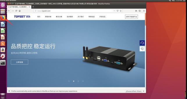 怎么检查 ubuntu 可不可以上网呢?打开浏览器,我们直接打开 ubuntu 的火狐浏览器,我们看一下 浏览器能不能上网,如果能上网,就说明我们 ubuntu 的网络是通的,那么就可以进行下一步了。我们直 接在浏览器的搜索栏里输入迅为的官网,我们看下能不能登录到这个官网里面去,这里也可以输入别的网 址,比如说百度,只要是能上网都是没有问题,我们现在已经登录到了我们的官网,那么就说明我们 ubuntu 的网络是通的。如下图所示