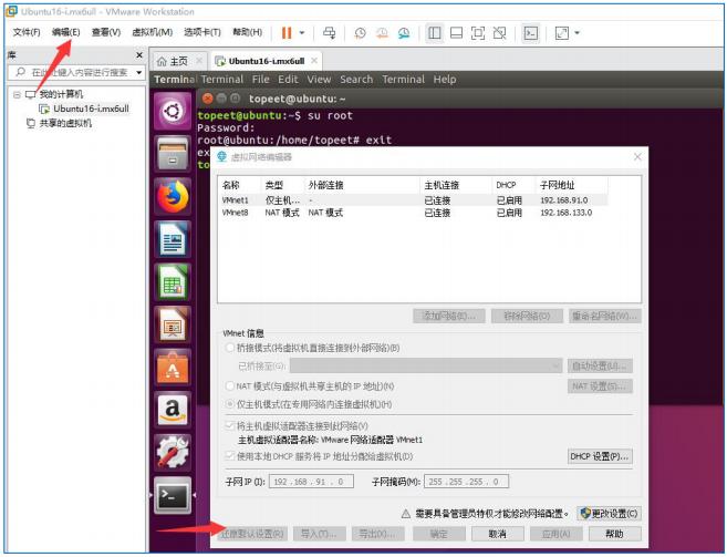 如果不可以登录到网页我们要怎么检查呢,第一,看一下自己的 ubuntu 是不是设置的桥接模式,如果是设置的桥接模式,我们点击虚拟机的编辑,点击虚拟网络编辑器,我们点击一下还原默认设置,现在这个按钮是灰的,我们要先把 ubuntu 关闭,这个按钮才可以点,如果大家的电脑不能上网,就设置一下这个,把他恢复成默认设置。如下图所示。