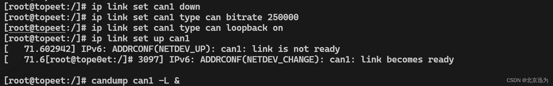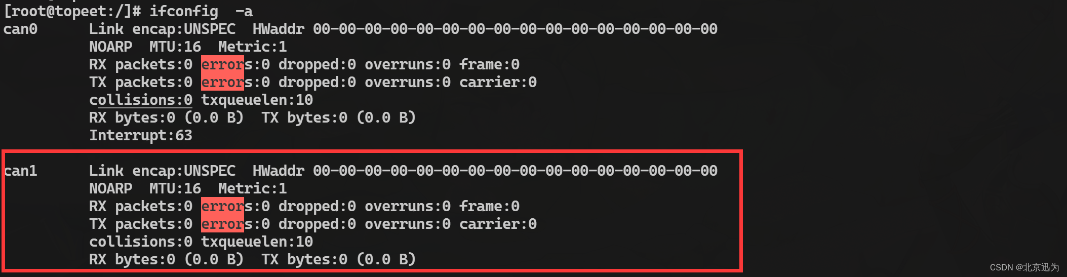 首先需要确保烧写的是上一小节修改编译出来的内核镜像,系统启动之后,输入“ifconfig -a”命令,如下图所示,可以看到生成的can1设备。