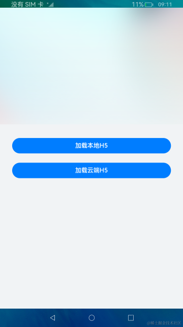 启动应用进入首页,页面提供两个按钮,分别对应加载本地H5和加载云端H5,点击按钮跳转到抽奖页面。