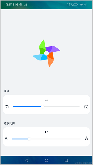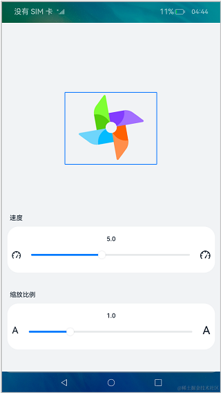 整个程序的页面构造十分简洁,由Image组件构成风车。自定义组件PanelComponent由Text组件和Slider组件构成,用来显示文本和控制图像,效果如图所示: