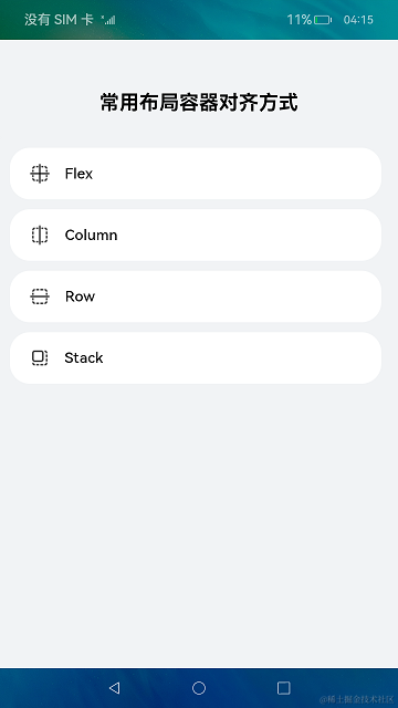 基于ArkTS扩展的声明式开发范式,实现Flex、Column、Row和Stack四种常用布局容器对齐方式。