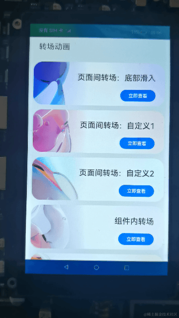 在本教程中,我们将会通过一个简单的样例,学习如何基于ArkTS的声明式开发范式开发转场动画。其中包含页面间转场、组件内转场以及共享元素转场。效果如图所示: