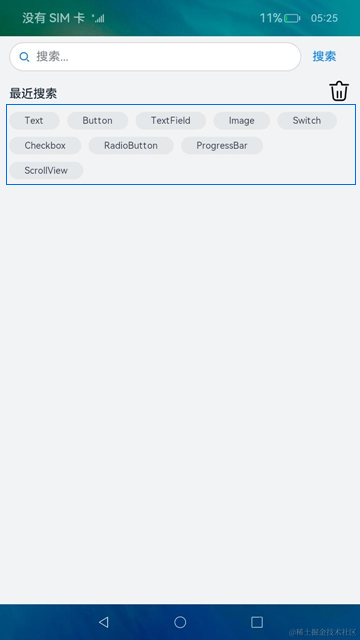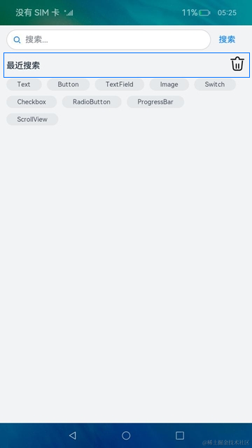 在这个章节中,我们需要完成搜索框布局的编写,并实现文本输入和点击事件。效果如图所示: