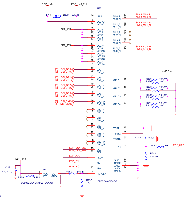 SN65DSI86作为一款MIPI DSI转eDP的芯片,支持双通道DSI输入,最大四通道显示输出,最大支持4K@60fps输出,WUXGA 1080P。本方案中将采用单通道DSI输入,双通道DP输出到1080p的屏幕。