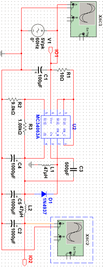 MC34063A在Multisim里面并没有直接提供的元件,今日恰遇到MC34063的Multisim扩展,于是尝试了一个交流5V输出负5V的电路。