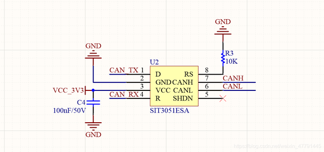 选择3.3V供电的SIT3051ESA芯片,这个芯片成本低,设计简单,而且高达1Mbps的数据传输速率