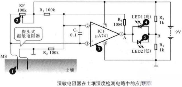 湿敏电阻在土壤湿度检测电路中的应用实例,如下图: