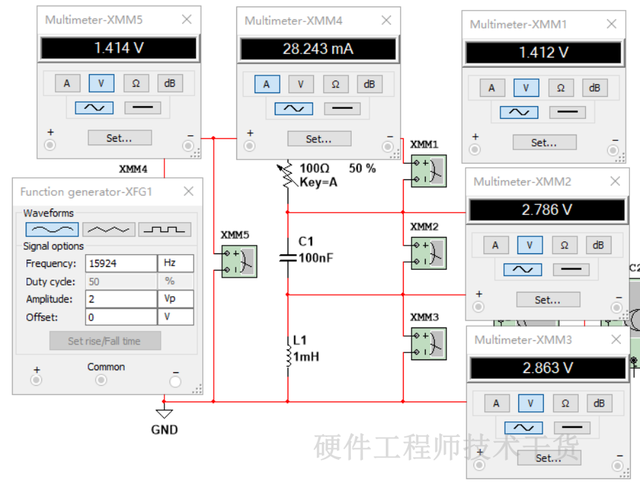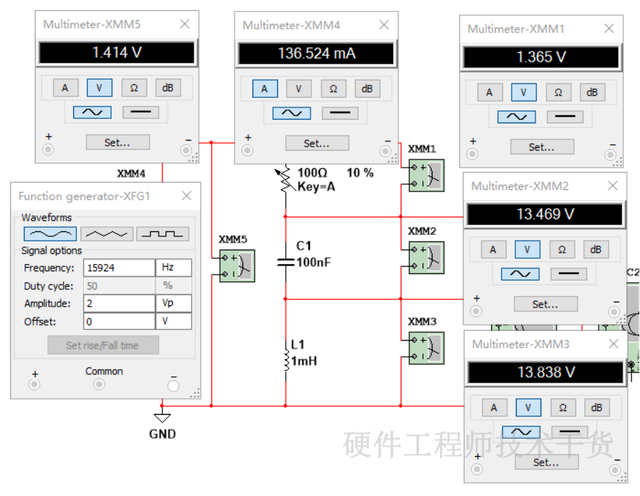 根据以上公式计算此电路谐振频率f=15924Hz。配置信号发生器为正弦波,频率15924Hz,振幅为2V,也就是输出有效值是1.414V。仿真数据如下: