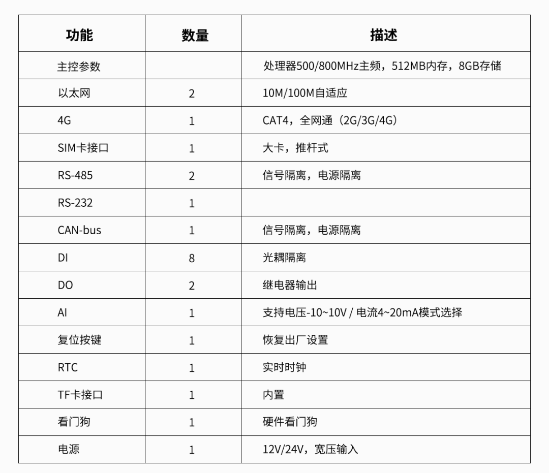 网关集成8路数字量输入(DI)、2路模拟量输入(-10V~+10V,4~20mA,支持2路继电器输出。