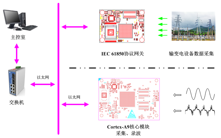 在输变电设备在线监测系统中,嵌入式Cortex-A8网关模块作为协议网关。控制前端模块对输变电设备相关状态信号进行采集,如:变压器油中溶解气体参数、容性设备介质损耗参数、变压器铁心电流参数、避雷器电流参数等;支持嵌入式 Linux操作系统,实现状态参数信号的处理功能,同时支持条件报警设置;作为协议网关,能够支持IEC 61850通信规约的运行,经以太网将采集到的数据上传到主控室。