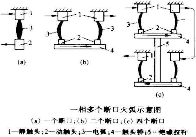 断路器设备常制成每相有两个或两个以上的串联断口。在相等的触头行程下,多断口比单断口拉弧更长,电弧拉长的速度也快,加速了弧隙电阻的增大。同时,由于加在每个断口上的电压降低了,使弧隙的恢复电压降低,因此灭弧性能更好。