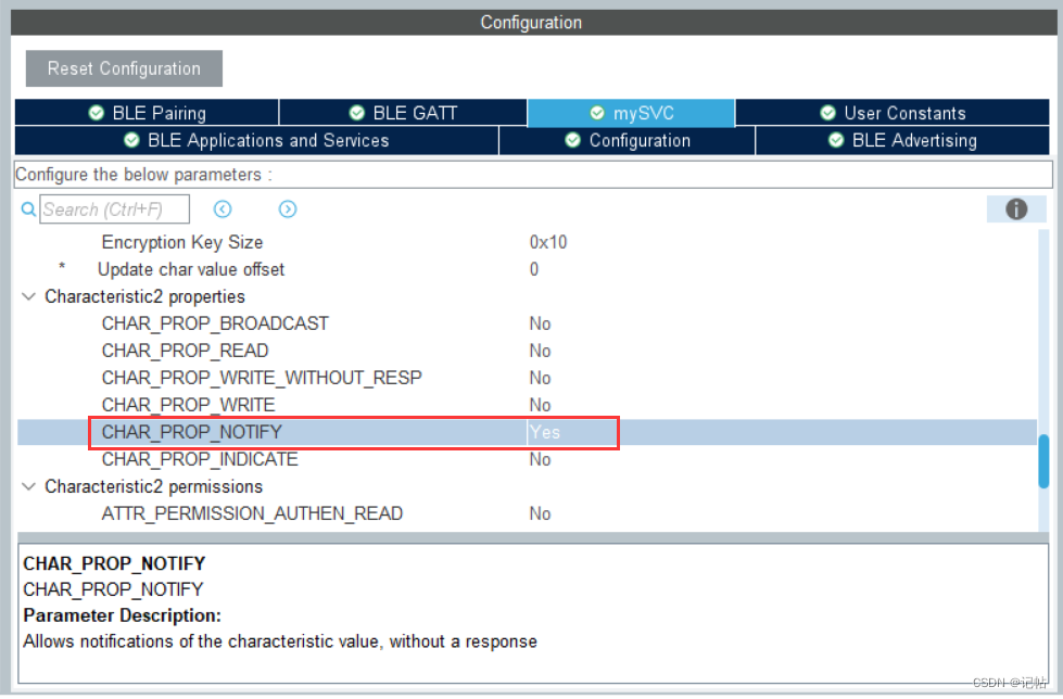启用CHAR_PROP_NOTIFY属性。 CHAR_PROP_NOTIFY 是一个参数描述,它允许设备在特性值发生变化时发送通知,而无需接收方响应。这种通知机制使得数据传输更加高效,因为发送方不需要等待接收方的确认。