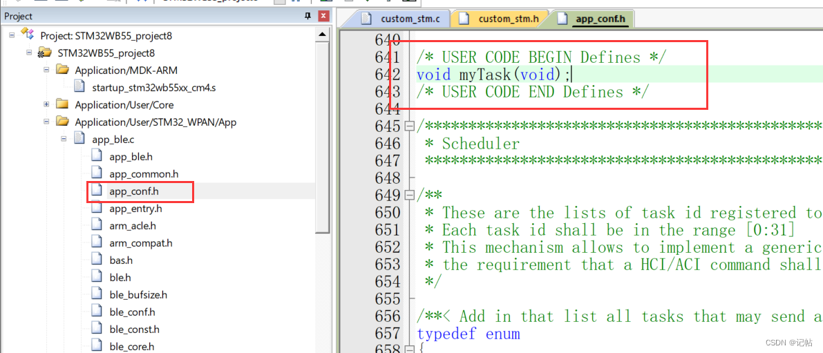 在app_ble.c中的蓝牙初始化中注册我们自己的任务和调度任务。 UTIL_SEQ_RegTask(1 << CFG_MY_TASK, UTIL_SEQ_RFU, myTask) 和 UTIL_SEQ_SetTask(1 << CFG_MY_TASK, CFG_SCH_PRIO_0) 是用于任务调度和任务优先级设置的。 UTIL_SEQ_RegTask(1 << CFG_MY_TASK, UTIL_SEQ_RFU, myTask) 将一个名为 myTask 的任务注册到任务调度器中。 UTIL_SEQ_SetTask(1 << CFG_MY_TASK, CFG_SCH_PRIO_0)为设置优先级。