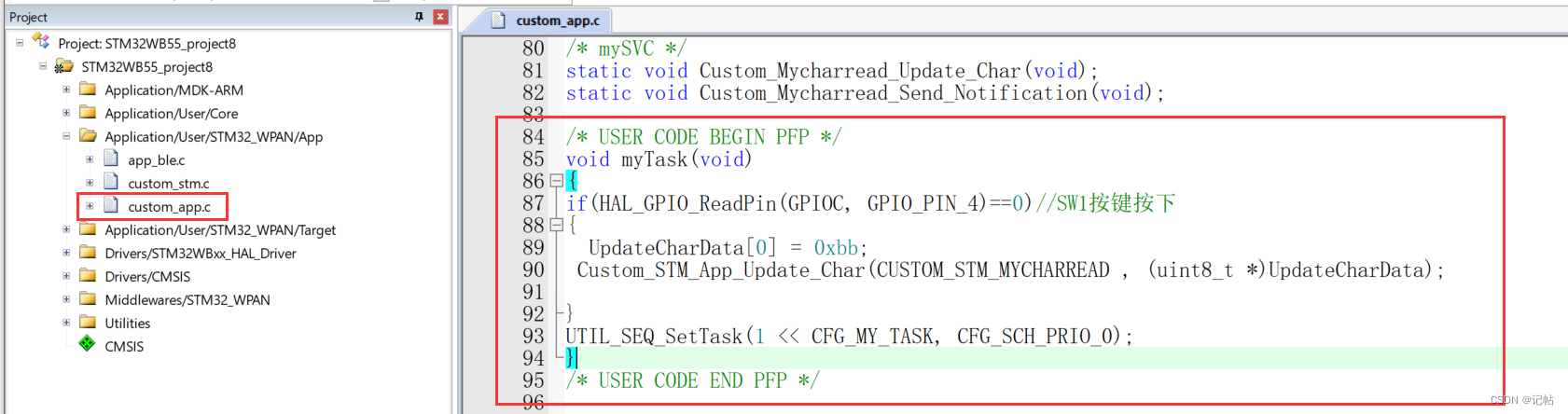 编写我们的myTask任务函数,通过检测PC4按键进行数据发送。 检测一个按键(SW1)是否被按下,如果按下则执行相应的操作,包括更新UpdateCharData数组的第一个元素,调用自定义函数Custom_STM_App_Update_Char进行处理,就是向手机APP发送一个0xbb的数据。