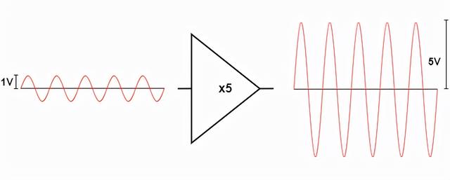 举个例子。下面这个放大器的输入信号幅度为 1 伏,输出信号的幅度变为 5 伏,增益为 5: