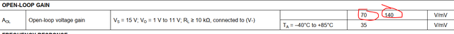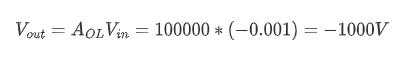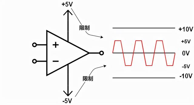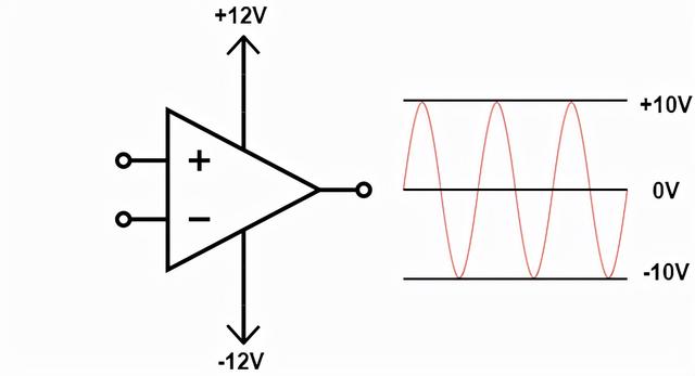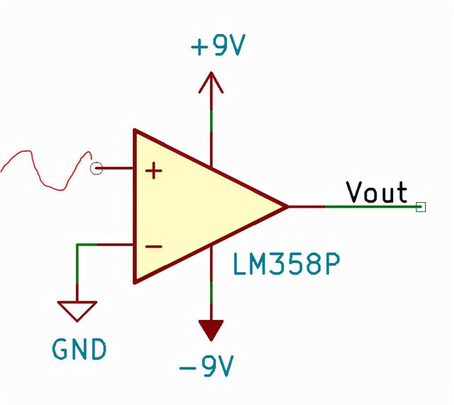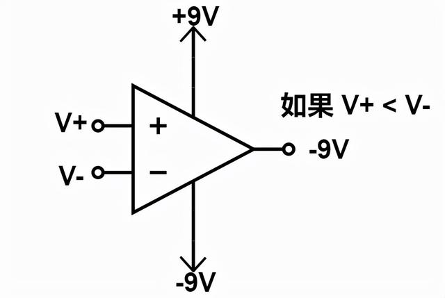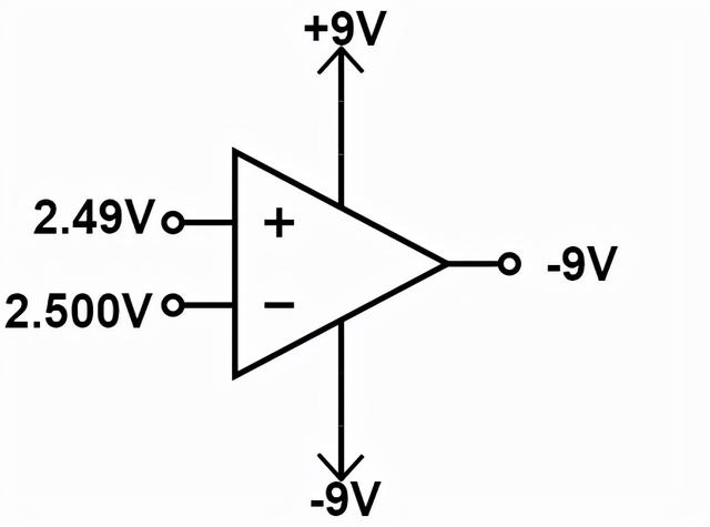 由于开环增益 AOL 非常大,我们以 10 万倍为例,假设正电源电压为 9 伏,负电源电压为 -9 伏。