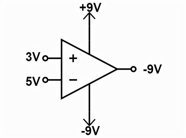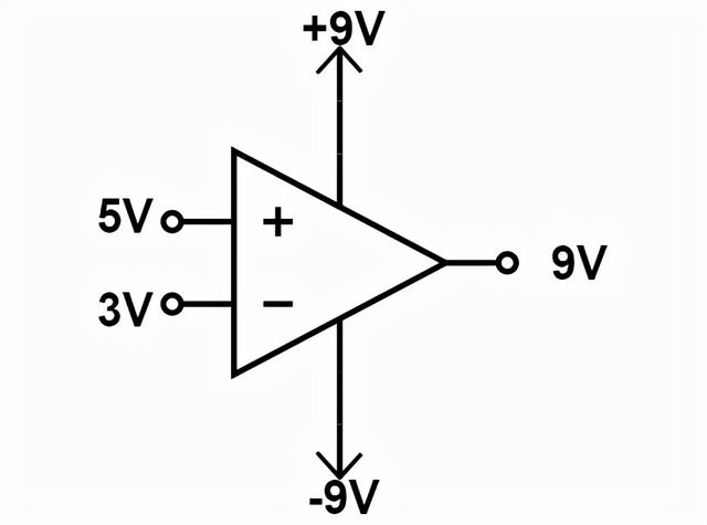 下图中, 5V < 3V, 因此运放的输出为 9 伏: