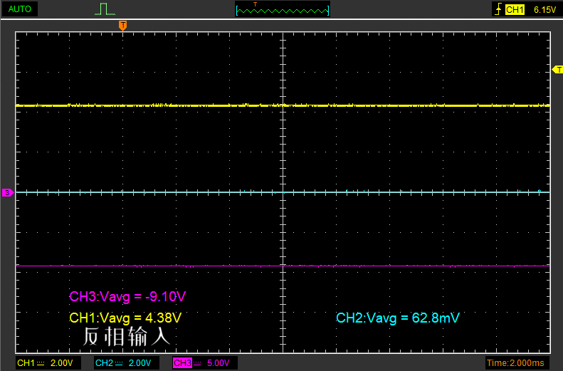 示波器探头 CH1 接反相输入引脚, 下图中黄色;示波器 CH2 接同相输入引脚,下图中青色;示波器 CH3 接运放输出引脚,紫色。我们将三个通道的零电平位置都放到垂直中间位置。