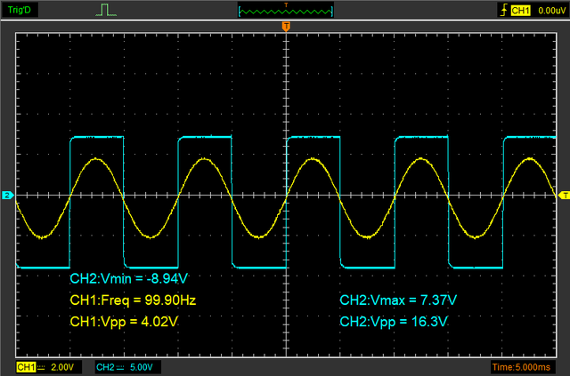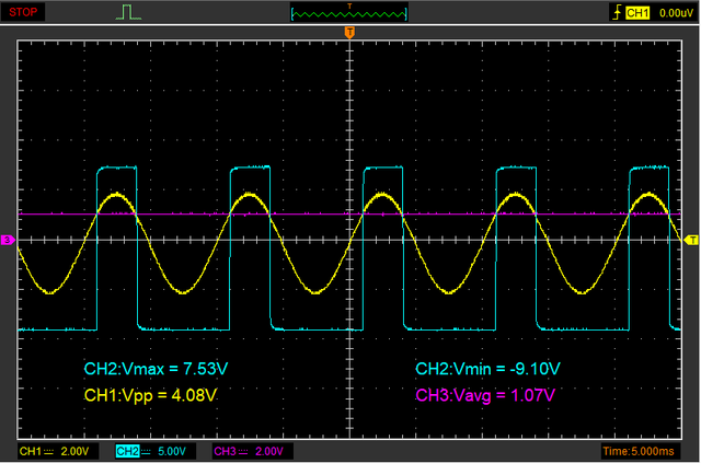 上图中,CH3 为反相端参考电压。CH1 为同相端输入信号,CH2 为输出引脚信号。可见,当信号大于 1 伏时,输出正电源电压;当信号小于 1 伏时,输出负电源电压。