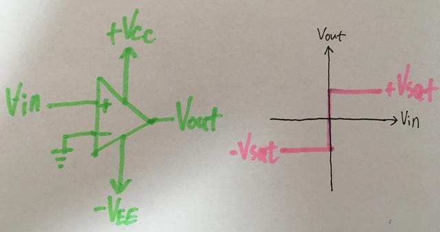 当 Vin 大于 0 伏时,输出为 +Vsat ;