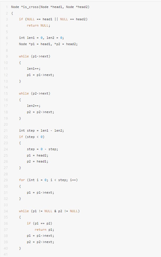 所以可以先计算两个链表的长度差,然后先移动一个指针,保证长度一样后,再同时向后走。代码也没什么难度,直接附上。