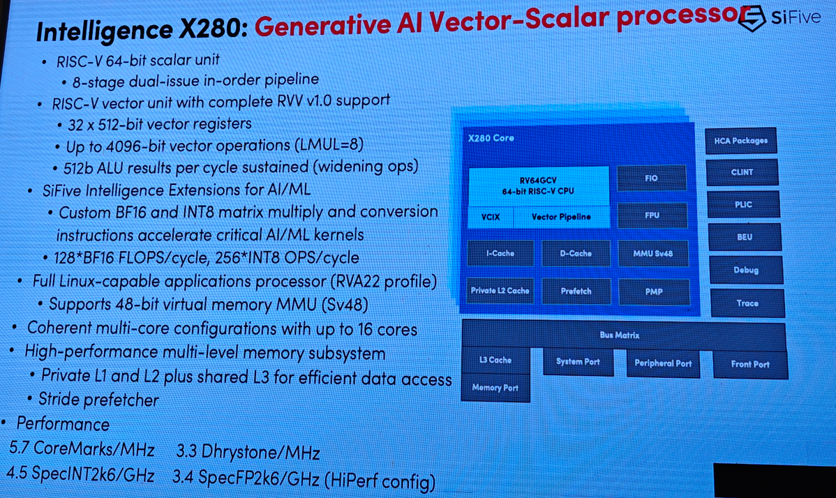 SiFive Inteligence:该系列在处理器设计上,采用最新的软件优先设计方法,具备高性能的矢量运算,满足人工智能与深度学习等领域各种应用的需求。X280是该系列中最新的产品,该产品已被包含谷歌在内的全球众多一线客户采用,后期这些客户也将把相关的工具、软件包、框架以及代码库开源出来惠及产业界。
