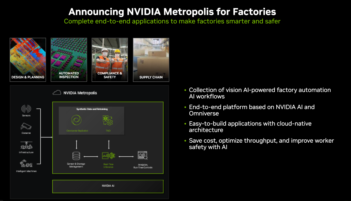 Metropolis则是一个工厂自动化工作流程的集合,旨在为AOI系统等应用开发提供先进的AI平台和工作流程。在不久前的COMPUTEX 2023上,NVIDIA展示了其在工厂中的应用,帮助工厂,或制造商开发、部署和管理具有竞争优势的定制化质量控制系统。据悉,富士康工业互联网、和硕、广达、西门子和纬创等超过50家制造业和工业自动化供应商,已经在使用Metropolis来优化他们的产线,以提高生产效率,降低成本。