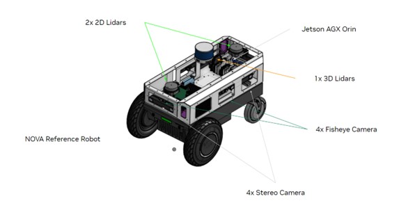 据了解,新发布的NVIDIA Isaac AMR主要基于Nova Orin参考架构构建,配备多个相机、LIDAR、雷达和其他先进的传感器和计算硬件,实现模拟中的映射自主性,并具备完整的一体化软硬件。
